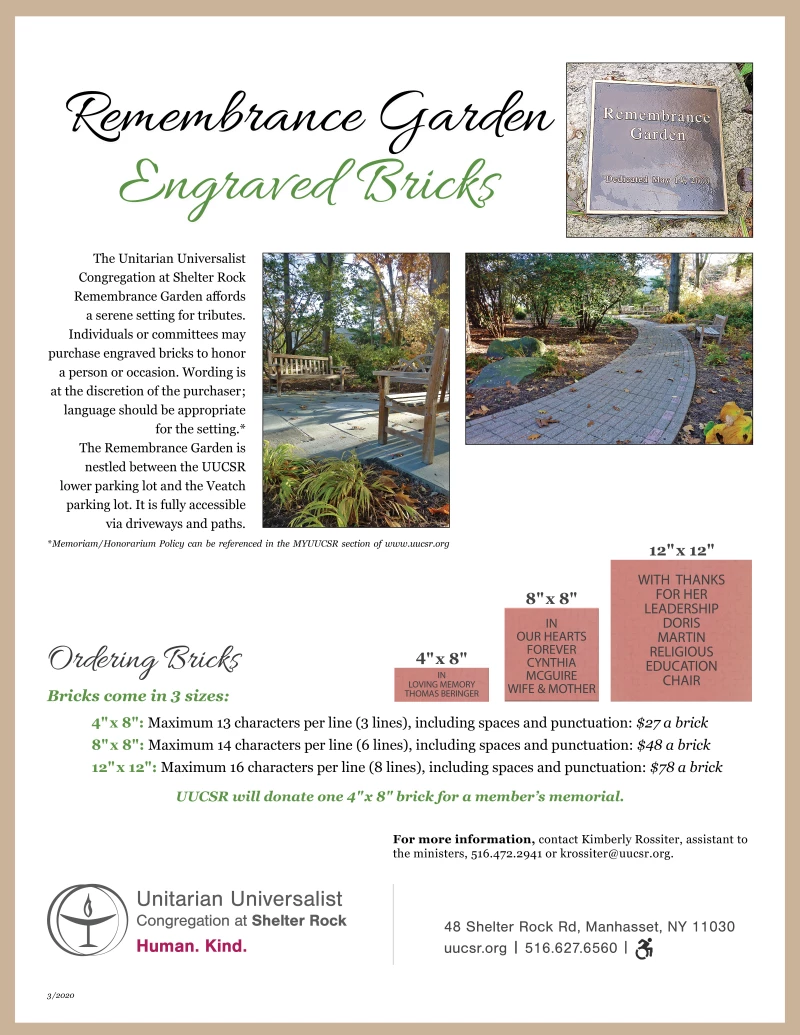 The UUCWNC Remembrance Garden affords a serene setting for tributes. Individuals or committees may purchase engraved bricks to honor a person or occasion. Wording is at the discretion of the purchaser; language should be appropriate for the setting. UUCWNC does not maintain a cemetery.